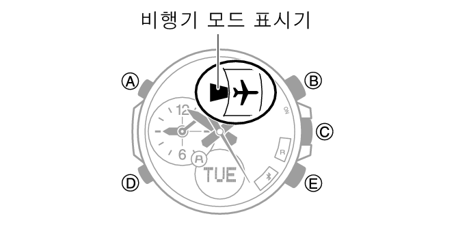 시계를 기내 모드로 전환 기내 모드로 이용하면 Bluetooth 무선 전파 발생이 사용 중지됩니다.병원, 공항 또는 무선 전파 발생이 제한된 모든 장소에서는 기내 모드로 전환합니다. 기내 모드 표시기가 나타날 때까지 (D)를 약 5초간 누릅니다. (D)를 약 5초간 누를 때마다 시계가 기내 모드로 전환되거나 해제됩니다.