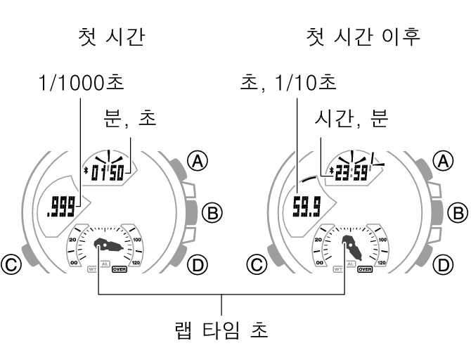 (B)를 누를 때마다 마지막 랩 타임 작동 이후 경과된 시간(랩 타임)이 약 8초간 표시됩니다.