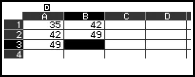 In het spreadsheetscherm kunt u de waarde in een cel als variabele opslaan. Als bijvoorbeeld de volgende bewerking wordt uitgevoerd wanneer het scherm in stap 3 wordt weergegeven, zal 42 (resultaat van de berekening van de in cel B1 ingevoerde formule) worden opgeslagen voor variabele A:
