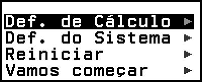 | Def. de Cálculo | Inclui itens de menu para configurar as definições da calculadora, como o formato de exibição para resultados de cálculos. |