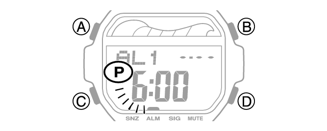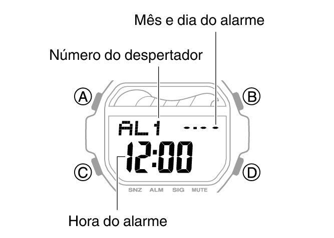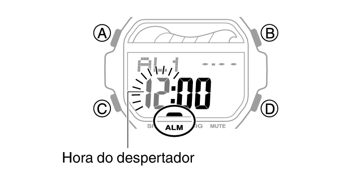 No Modo do despertador, mantenha (D) pressionado para soar o alarme.