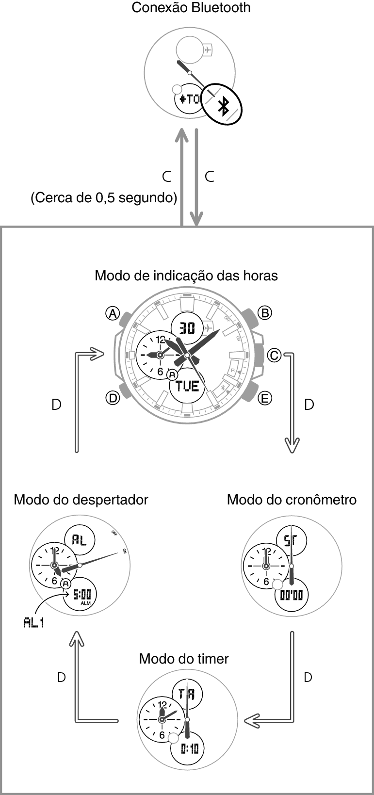 Use (D) para navegar entre os modos. Pressione (D) por cerca de dois segundos para entrar no Modo de indicação das horas. Para conectar a um telefone, pressione (C) por cerca de 0,5 segundo.