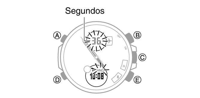 2.Pressione (D) seis vezes até que os segundos pisquem no visor.