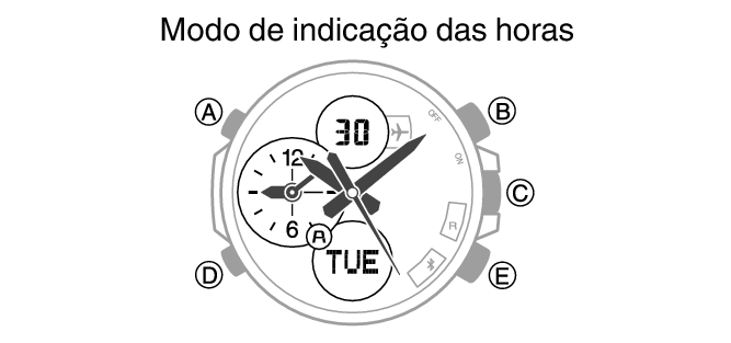 Outros ajustes Início Execute este procedimento no Modo de indicação das horas. Use (D) para navegar ao Modo de indicação das horas. Navegação entre modos