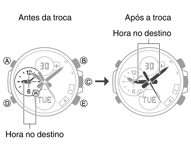 Use o procedimento abaixo para mudar, facilmente, os ajustes de data e hora do relógio para um local de destino.