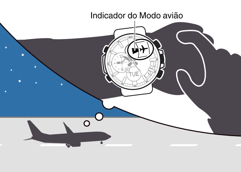 Coloque o relógio no Modo avião quando receber as instruções pela tripulação.