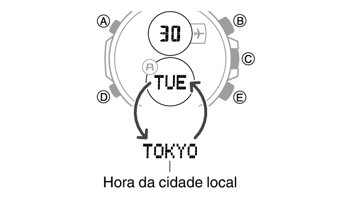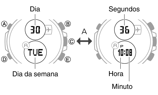 No Modo de indicação das horas, é possível utilizar a operação abaixo para alterar o conteúdo dos visores digitais.