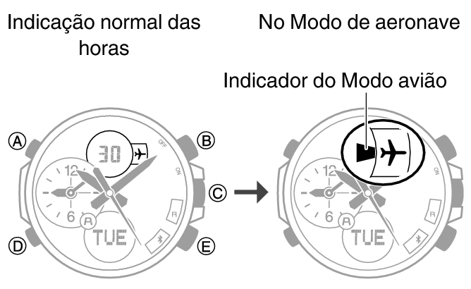 Quando estiver em um hospital, em uma aeronave ou em qualquer outra área onde o uso de ondas de rádio seja proibido, pressione o botão (D) do relógio por cerca de cinco segundos para entrar no Modo de aeronave.