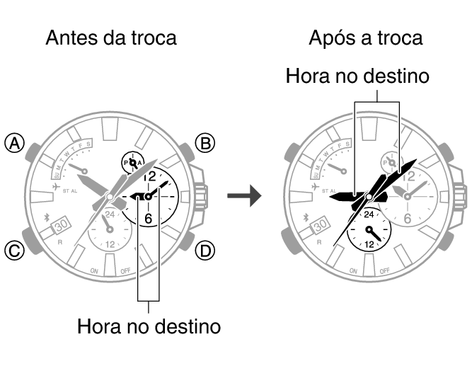 Use o procedimento abaixo para mudar, facilmente, os ajustes de data e hora do relógio para um local de destino.