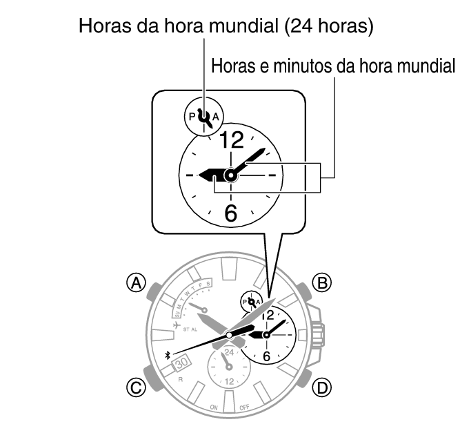 - No modo do Calendário, você pode verificar a hora mundial com o ponteiro das horas e minutos pequeno.