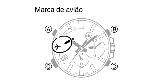 - Sempre que (A) for mantido pressionado por cerca de quatro segundos, o relógio entrará ou sairá do Modo avião.