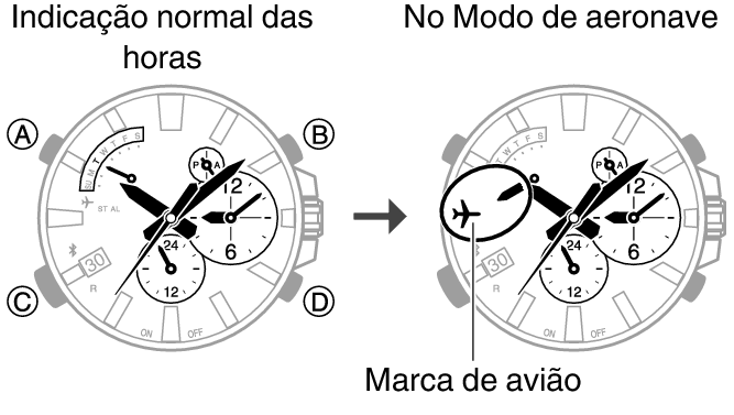 Quando estiver em um hospital, em uma aeronave ou em qualquer outra área onde o uso de ondas de rádio seja proibido, pressione o botão (A) do relógio por cerca de quatro segundos para entrar no Modo de aeronave.