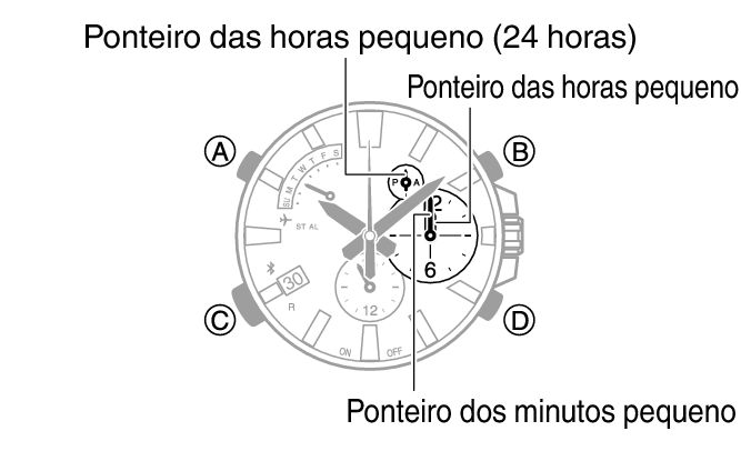Isso habilita o ajuste dos ponteiros pequenos de hora e de minuto, e o alinhamento do ponteiro pequeno de 24 horas.