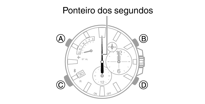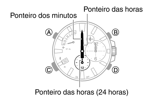 Isso habilita o ajuste dos ponteiros de hora e de minuto, e o alinhamento do ponteiro de 24 horas.