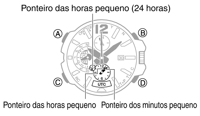 Segure (A) por cerca de um segundo para alterar o ajuste da Hora mundial para UTC (Tempo Universal Coordenado). Os ponteiros menores de hora e minuto (formato de 24 horas) indicarão o UTC atual (Tempo Universal Coordenado).