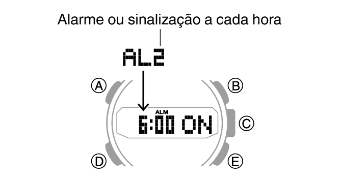 2.Pressione (E) para navegar pelos números do alarme (de [AL1] a [AL5]) e pelas telas de sinalização a cada hora ([SIGNAL]) até que seja exibida aquela que você deseja configurar.