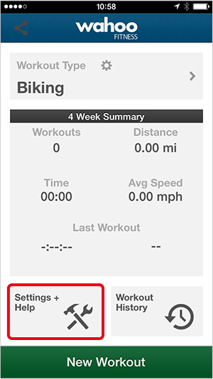 В верхней части экрана Wahoo Fitness коснитесь [Settings + Help] (Настройки + Помощь).