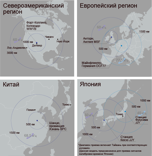 - ● Если часы находятся в регионе, где возможен прием сигнала калибровки поддерживаемого времени, они будут автоматически выполнять прием сигнала каждую ночь.