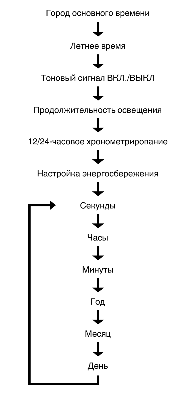 При каждом нажатии кнопки (D) происходит последовательное переключение отображения информации на экране режима «Часы» в приведенном ниже порядке.