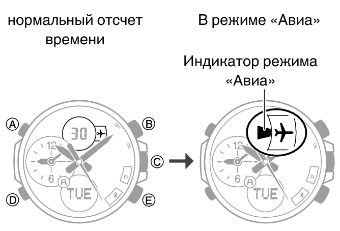 Когда вы находитесь в больнице, самолете или другом месте, где использование радиосигналов запрещено, удерживайте на часах кнопку (D) около пяти секунд, чтобы переключиться в режим «Авиа».