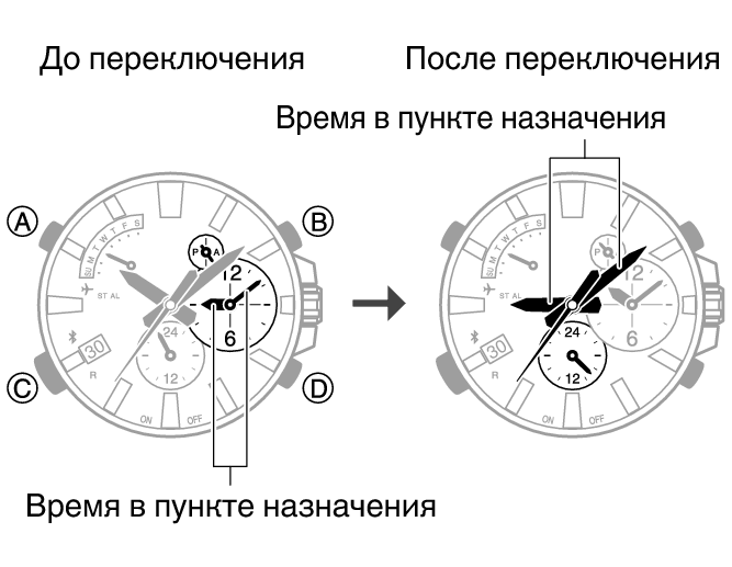 2.Переключитесь с часового пояса точки отправления на часовой пояс пункта назначения.