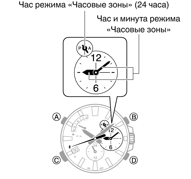 - В режиме «Календарь» мировое время можно проверить по малой часовой и минутной стрелке часов.