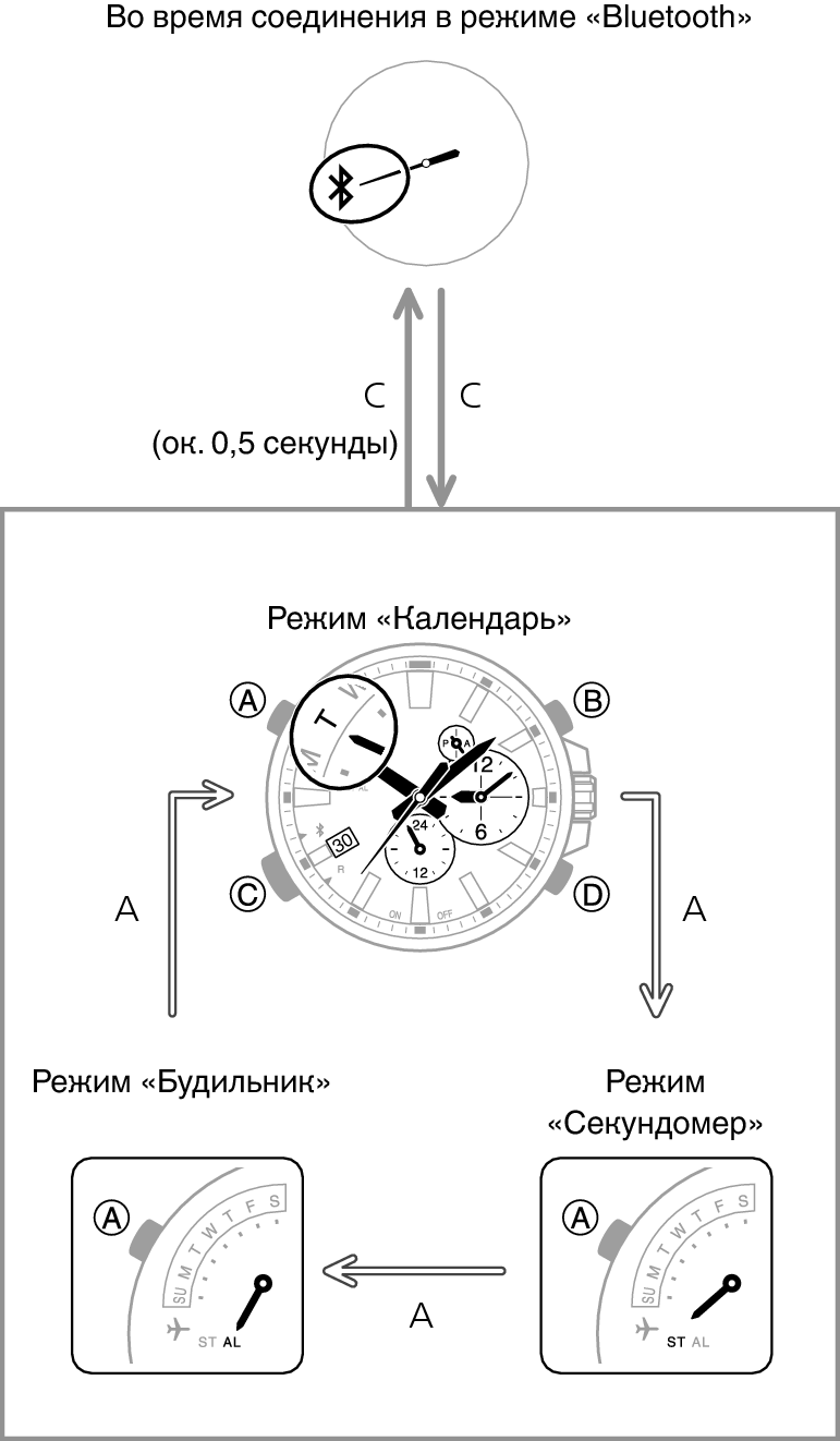 Используйте (A) для перехода между режимами. Нажмите и удерживайте кнопку (A) около двух секунд, чтобы перейти в режим календаря. Для установки соединения с телефоном нажмите и удерживайте (C) около 0,5 секунд.