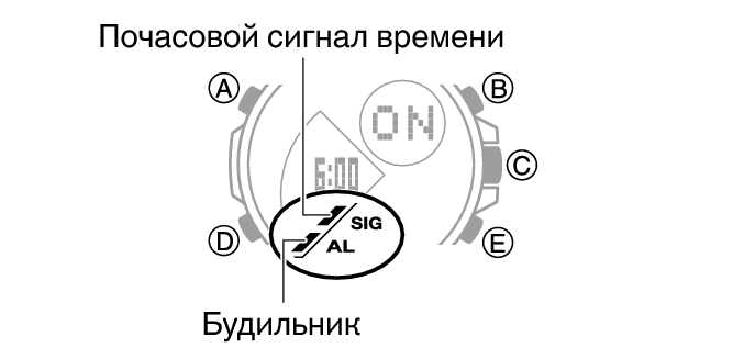Определение статуса будильника (Вкл./Выкл.) Индикаторы отображаются, когда включен любой из будильников или почасовой сигнал времени.