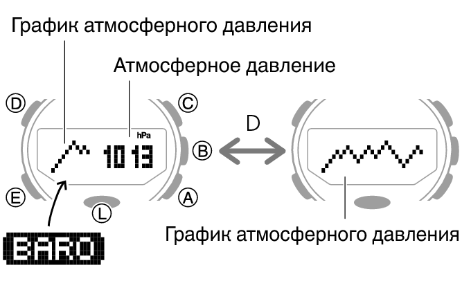 • После перехода в режим барометра часы будут снимать показания приблизительно каждые пять секунд в течение трех минут. После этого они будут снимать показания приблизительно каждые две минуты или каждые пять секунд.
