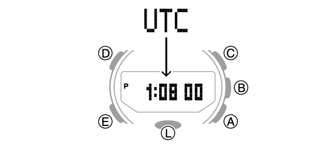 В режиме мирового времени одновременное нажатие (A) и (C) установит UTC (всемирное координированное время) в качестве города мирового времени и отобразит текущее время.