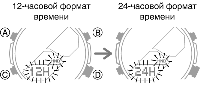 Нажмите кнопку (D) для переключения между [12H] (12-часовой формат) и [24H] (24-часовой формат).