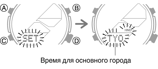 Нажмите и удерживайте кнопку (A) не менее двух секунд. Отпустите кнопку, когда на дисплее появится название выбранного города основного времени.