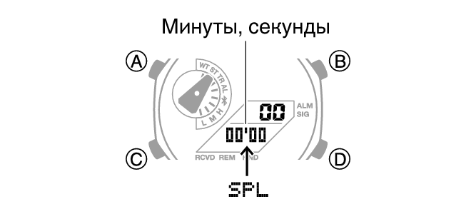Если вы нажмете кнопку (A), в течение восьми секунд будут попеременно отображаться прошедшее до текущего момента время (время промежуточного результата) и индикатор [SPL].