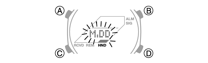 Нажмите и удерживайте кнопку (A) не менее двух секунд, пока не появится название выбранного в данный момент города основного времени.