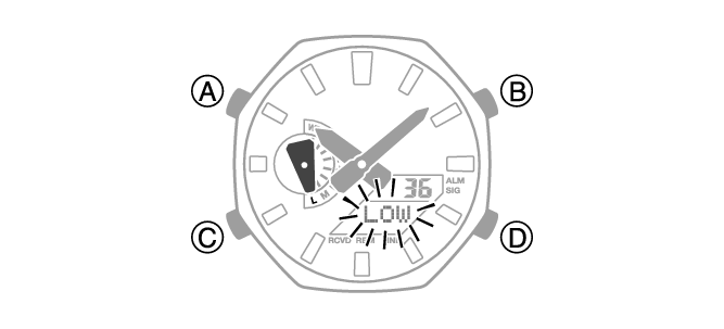 Если уровень заряда снизится еще больше, начнет мигать индикатор [CHG], а часовая и минутная стрелки остановятся на 12 часах. Если это произойдет, все функции будут отключены.