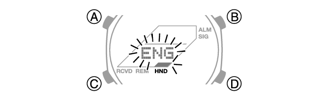 Нажмите и удерживайте кнопку (A) не менее двух секунд, пока не появится название выбранного в данный момент города основного времени.