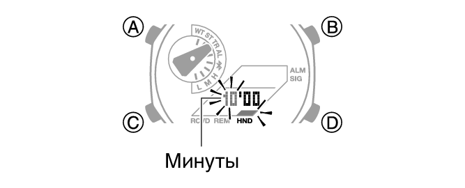 С помощью кнопок (B) и (D) измените значение минут.