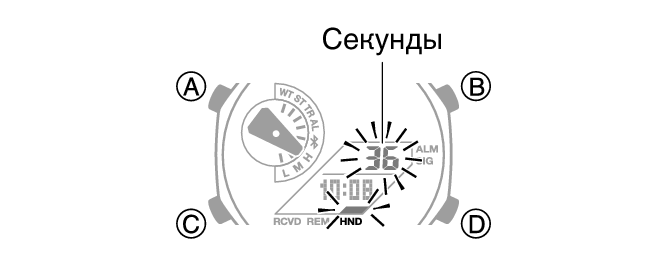 Нажмите и удерживайте кнопку (A) не менее двух секунд, пока не появится название выбранного в данный момент города основного времени.