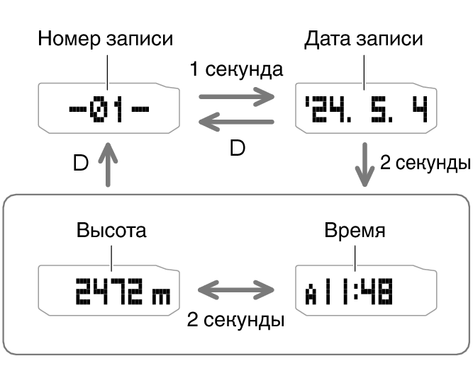 Если в pежим «Восстановление данных записи высоты» не будет выполнено никаких действий в течение трех минут, часы автоматически возвращаются в режим «Часы».