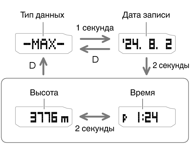 Нажатие (D) возвращает на верхний экран (номер записи, DSC, ASC, MAX или MIN) просматриваемых данных.