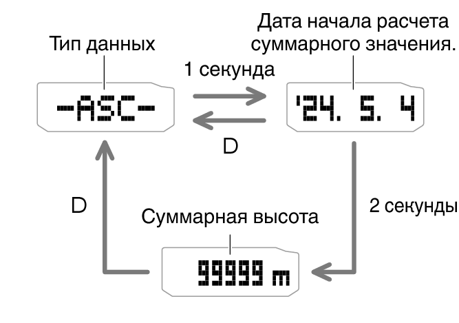 Если суммарное значение подъема (ASC) или снижения (DSC) превышает 99 999 м (327 995 футов), оно вернется к значению 0 и будет рассчитано заново.