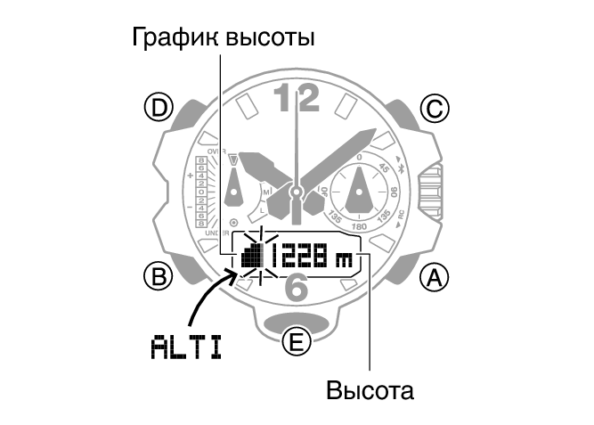 Если во время измерения высоты часовая и/или минутная стрелка перекрывают цифровой дисплей, стрелки временно перемещаются в положение 22 секунды или 38 секунд, облегчая считывание значений измерения. Через три секунды стрелки возвращаются в свое нормальное положение.