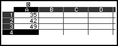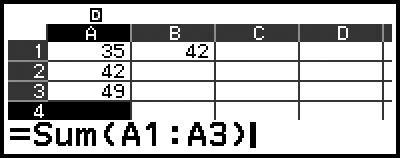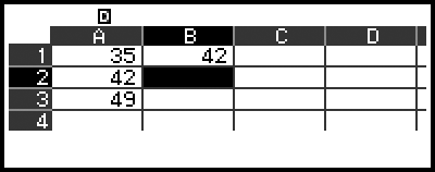 På kalkybladsskärmen kan du lagra värdet i en cell till en variabel. Om du till exempel utför följande åtgärd medan skärmen i steg 3 visas kommer 42 att lagras (beräkningsresultatet för formeln som matats in i cell B1) till variabel A: