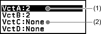 Skärmen för vektorvariabellista är den ingångsportal du ska använda när du vill lagra en vektor i vektorvariabeln VctA, VctB, VctC eller VctD, eller för att redigera en tidigare lagrad vektor. Status för varje vektorvariabel anges enligt exemplen nedan.