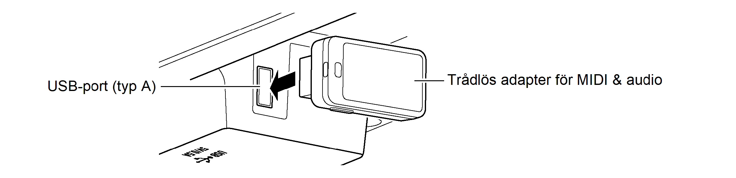 Anslut den trådlösa adaptern för MIDI & audio till USB-porten (typ A) på digitalpianot.