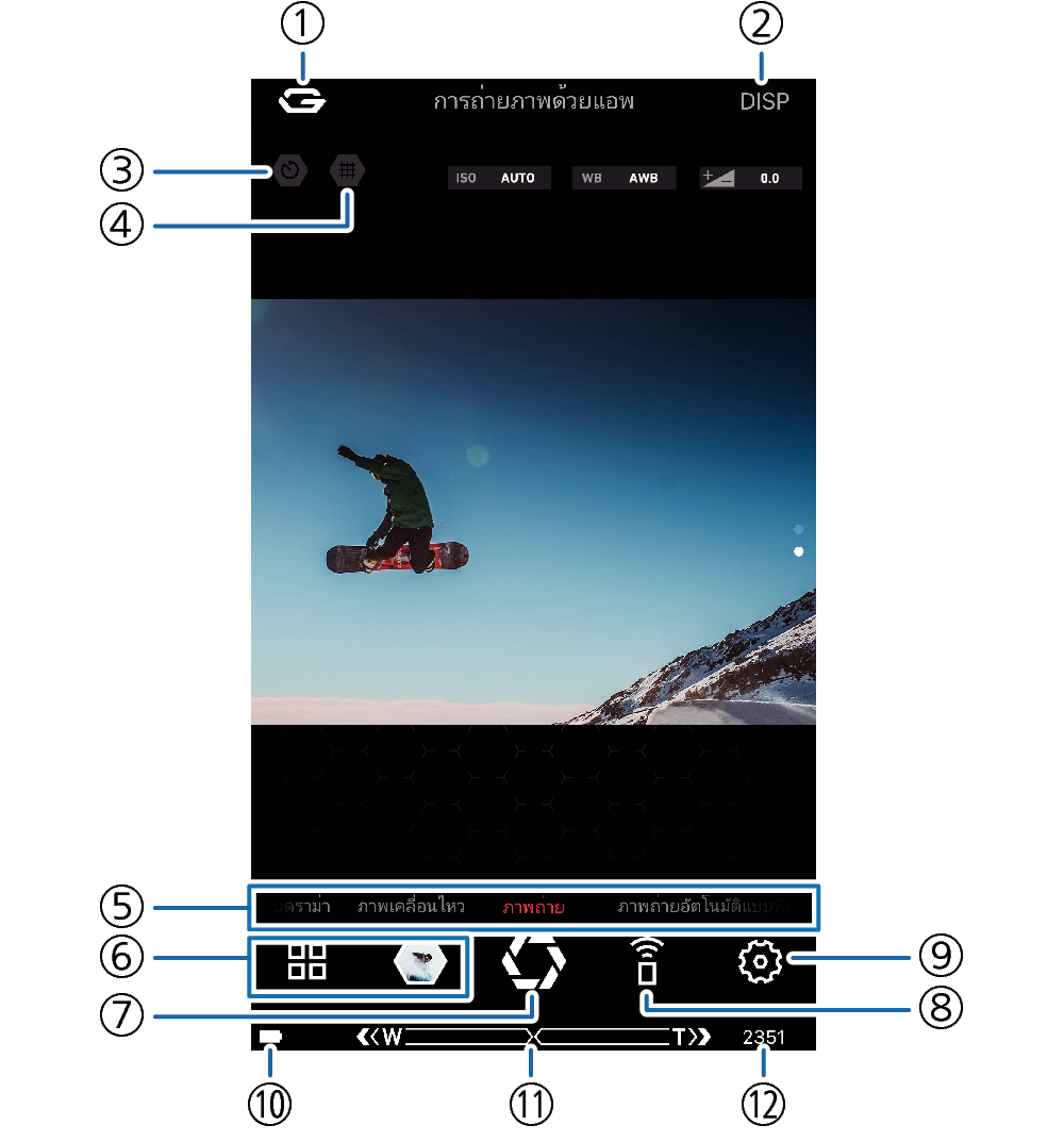 คุณสามารถใช้แอพ Gʼz EYE เพื่อกำหนดการตั้งค่าการถ่ายภาพและเพื่อถ่ายภาพได้ โปรดทราบว่าปุ่มบนกล้องหรือบนตัวควบคุมที่เป็นอุปกรณ์เสริมจะใช้เพื่อถ่ายภาพไม่ได้ในขณะที่คุณกำลังถ่ายภาพด้วยแอพ Gʼz EYE