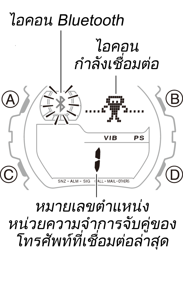- ในโหมดบอกเวลาปกติ กดปุ่ม B ค้างไว้ประมาณสองวินาทีจนกระทั่งไอคอน Bluetooth บนหน้าปัดนาฬิกาหายไป
