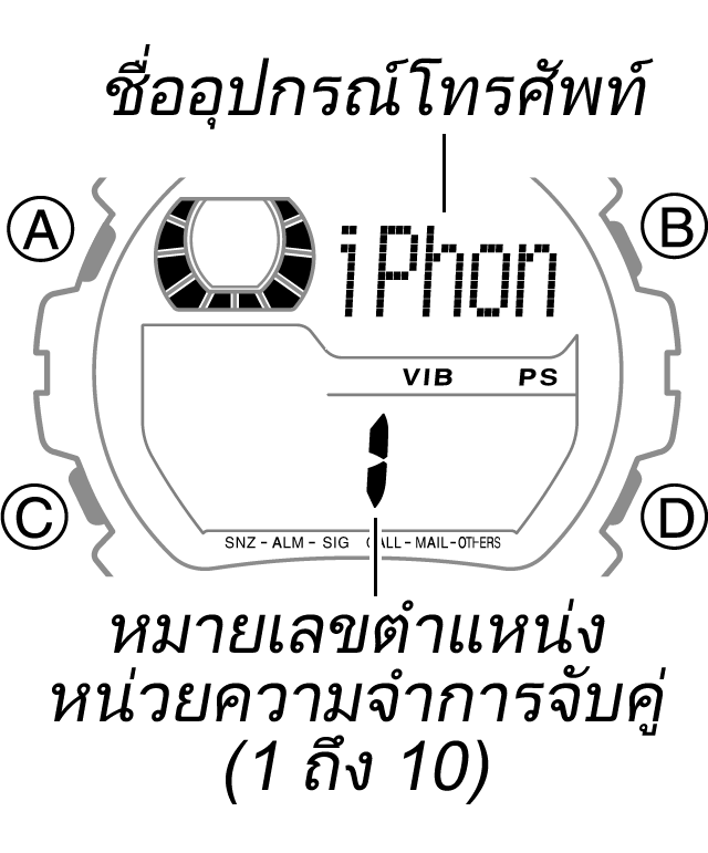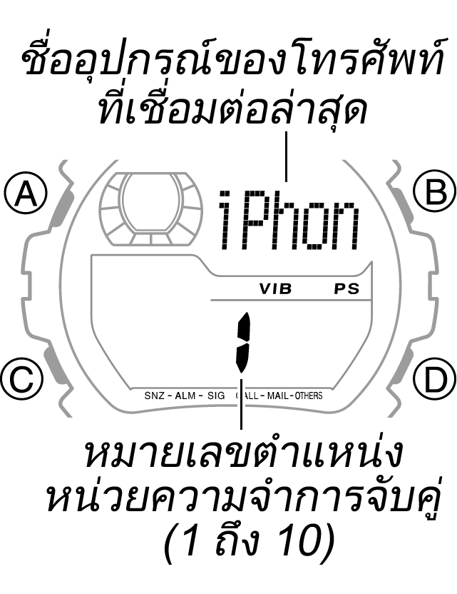 - ซึ่งจะแสดงหมายเลขตำแหน่งหน่วยความจำการจับคู่ของโทรศัพท์ ที่เชื่อมต่อกับนาฬิกาล่าสุด