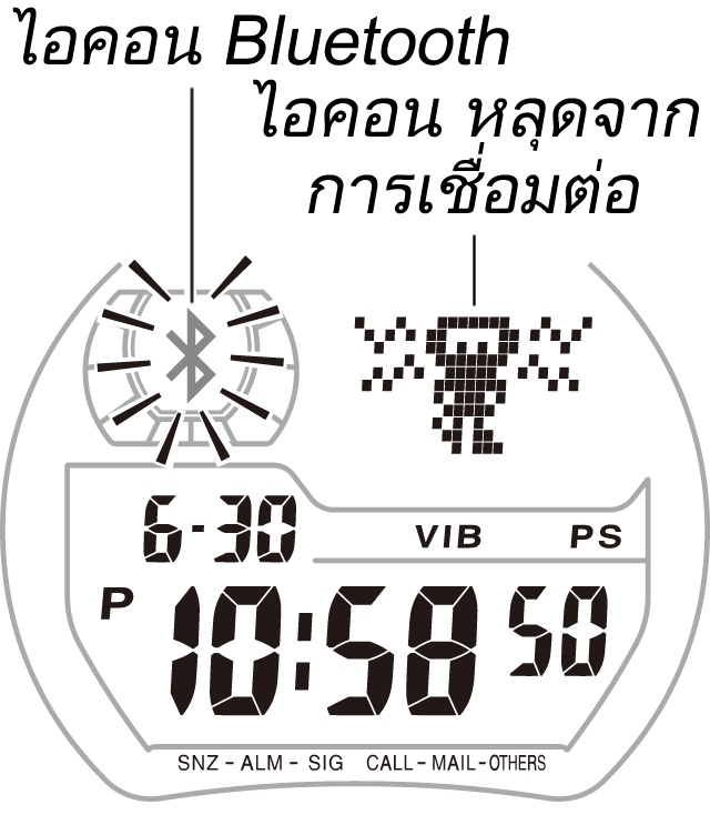 - ทุกครั้งในแต่ละนาทีหลังจากขาดจากการเชื่อมต่อ นาฬิกาจะพยายามเชื่อมต่อใหม่โดยอัตโนมัติ ในระหว่างความพยายามเชื่อมต่อใหม่ในแต่ละครั้ง ไอคอน Bluetooth จะกะพริบบนหน้าปัดนาฬิกาและไอคอนกำลังเชื่อมต่อจะปรากฏขึ้น ถ้าการเชื่อมต่อใหม่สำเร็จ นาฬิกาจะกลับสู่โหมดบอกเวลาปกติและแสดงไอคอน Bluetooth ถ้าการเชื่อมต่อใหม่ล้มเหลว นาฬิกาจะกลับสู่โหมดบอกเวลาปกติโดยไม่แสดงไอคอน Bluetooth