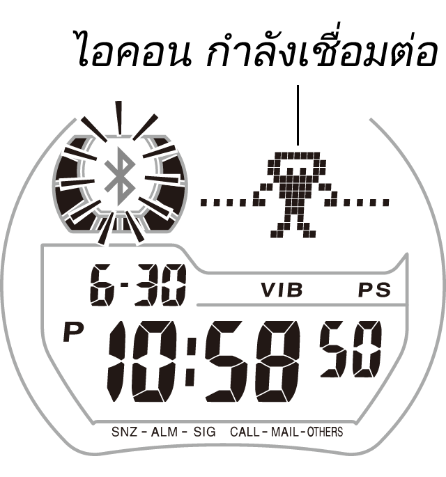 นาฬิกาจะกลับสู่โหมดบอกเวลาปกติและแสดงไอคอน Bluetooth (ไม่กะพริบ)
